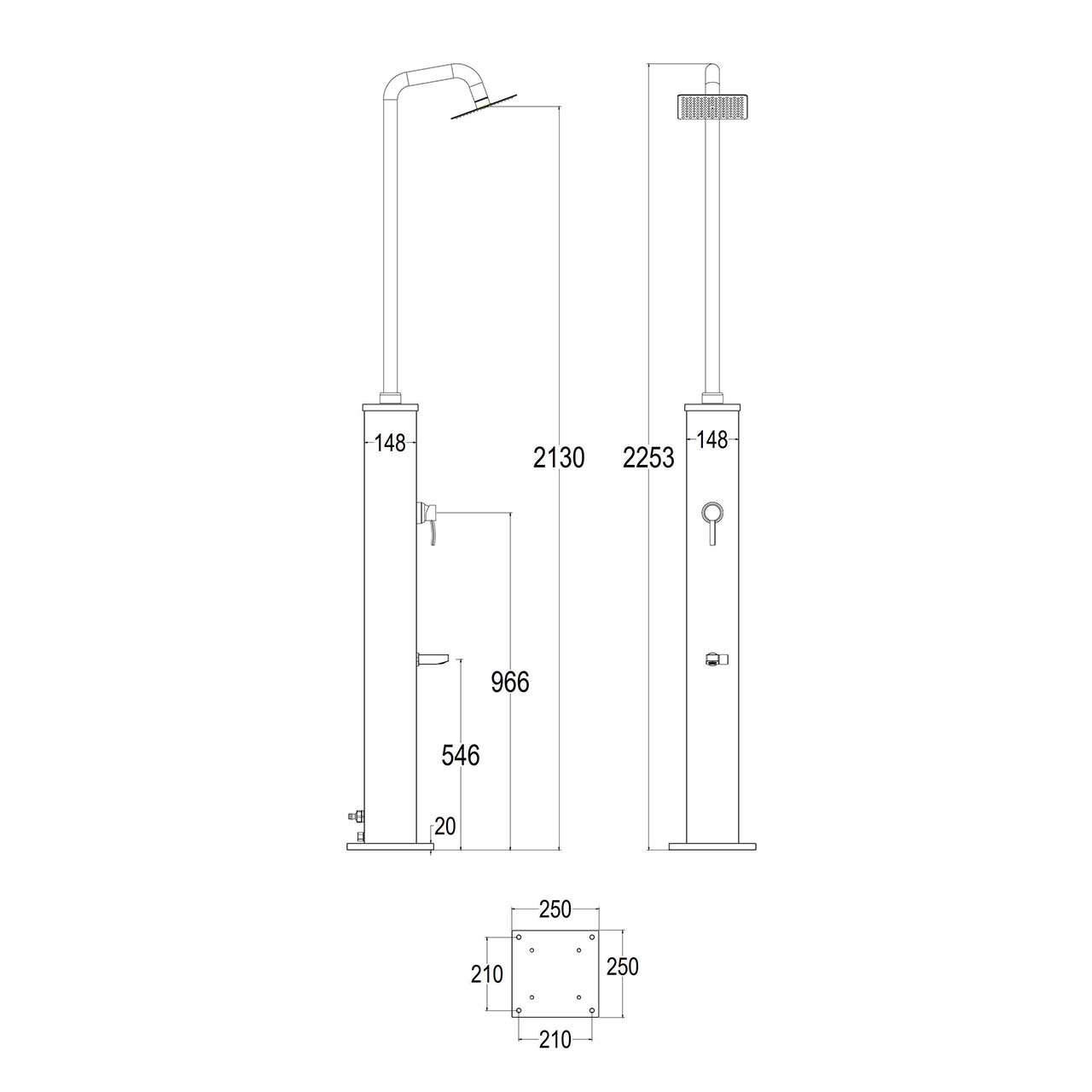 Altura 225 cm, dimensiones de la base 25×25 cm