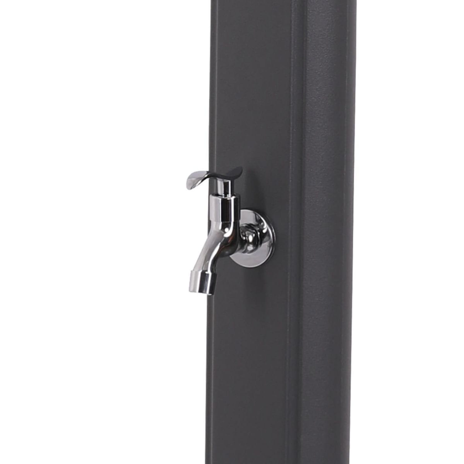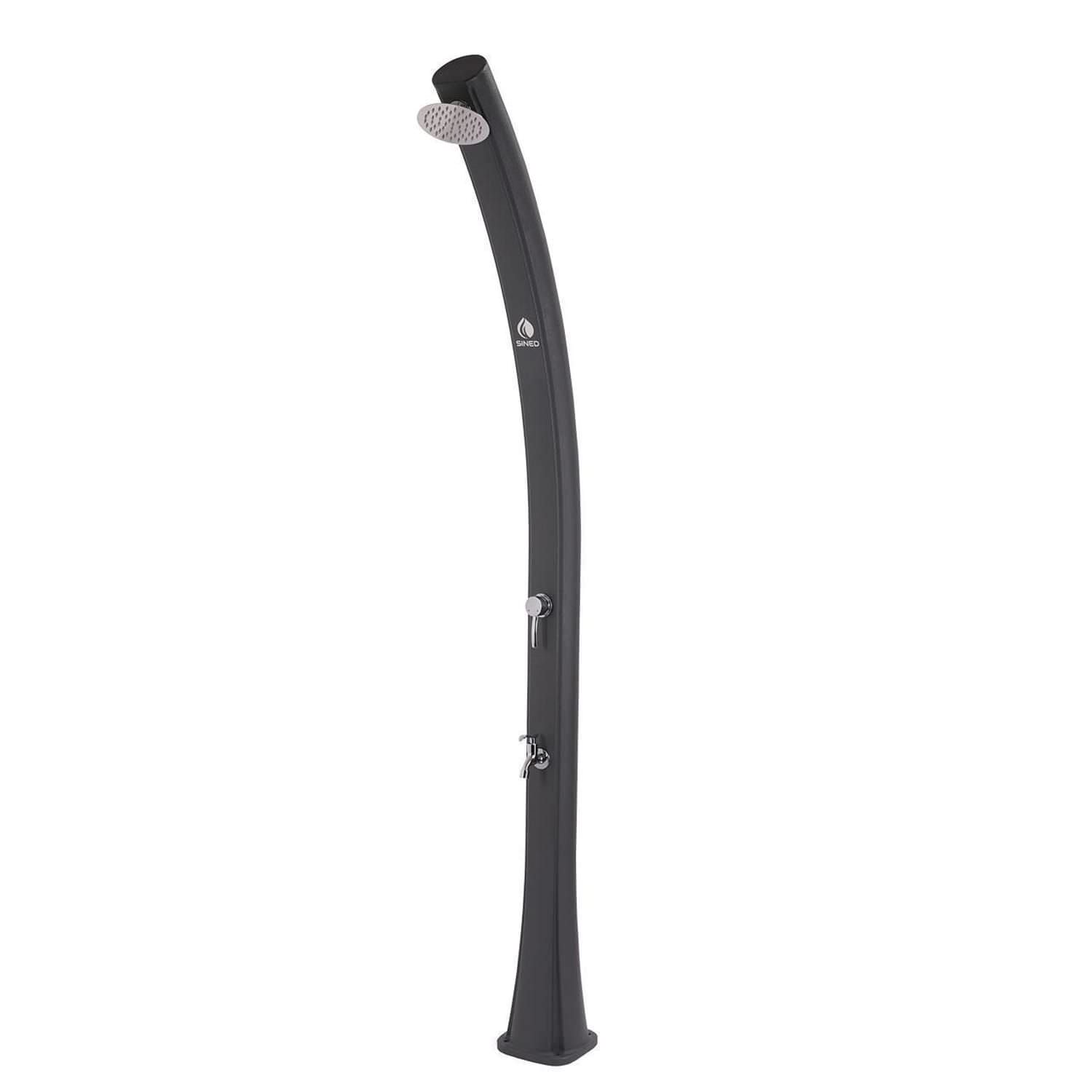 SINED DOCCIA-SOLE-GRIGIA Ducha Solar Para Piscina. Estructura Curvada En Polietileno Hd Para Uso Exterior. Accesorios En Metal Gris. Altura 226 Cm Ducha Redonda Diámetro 15,24 Cm Depósito 25 Litros Grifo Lavapiés. Filtro Antical y Tapa De Ducha.