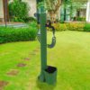 Fuente de jardín verde con cubo de 5 litros de capacidad y recogedor de hojas de hierro fundido. Predisposición con acoplamientos rápidos para manguera de jardín. Recomendado para todas las actividades al aire libre, tanto públicas como privadas, por su calidad de construcción y sus accesorios exclusivos. La conexión de agua lateral es de HDPE (polietileno de alta resistencia) y es resistente a los rayos UV, a la cal y a la salinidad, perfecta también para entornos marinos.