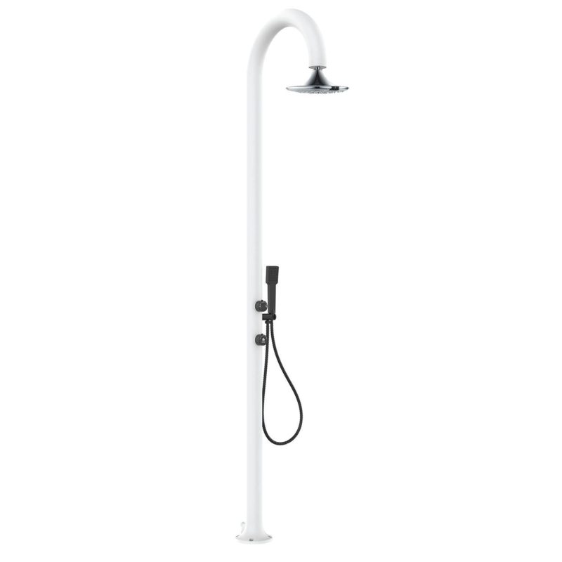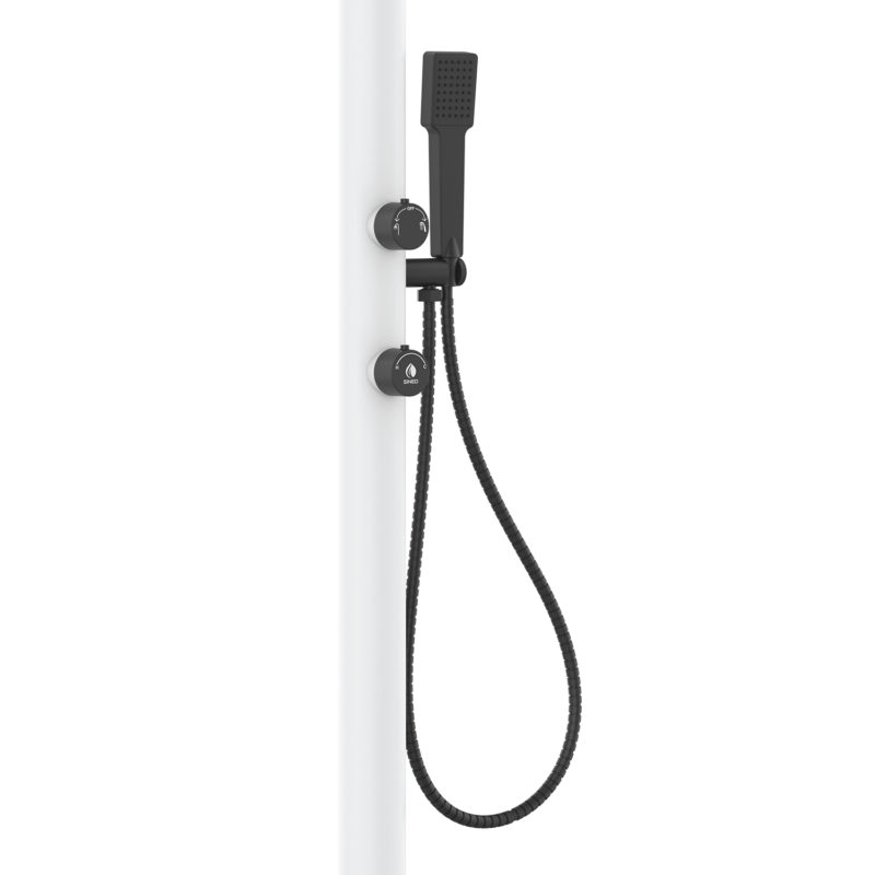 LUNA-ALU-D-BIANCA-SENSOR SINED Ducha Jardín de aluminio blanco con sensor y ducha de mano Doble toma de agua fríacaliente Conexión lateral o inferior Para exteriores o interiores LUNA ALU D BIANCA SENSOR